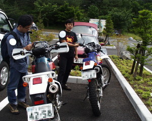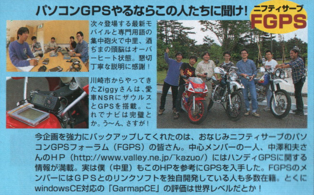99/06/17 山梨県富士ビジターセンターにてチャンプU誌GPS特集の取材。 取材協力FGPSメンバー。 Ziggyさんのガーミン付きNSR 俺様のロカティオ撮影中。 チャンプU誌8月号に載るかも〜って言いいふらしたのにボツってしまうことは世の常(爆) ↑載ったっす。 広報車。左が純正GPS付きジェベル。 ここからロカティオのデジカメ画像。
